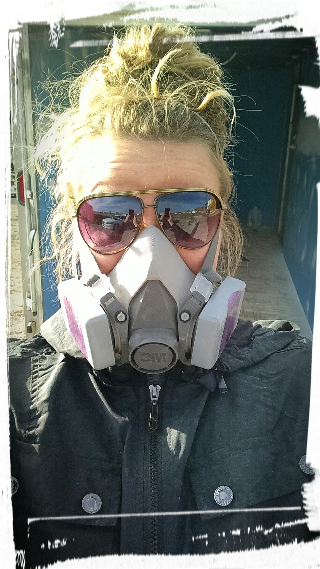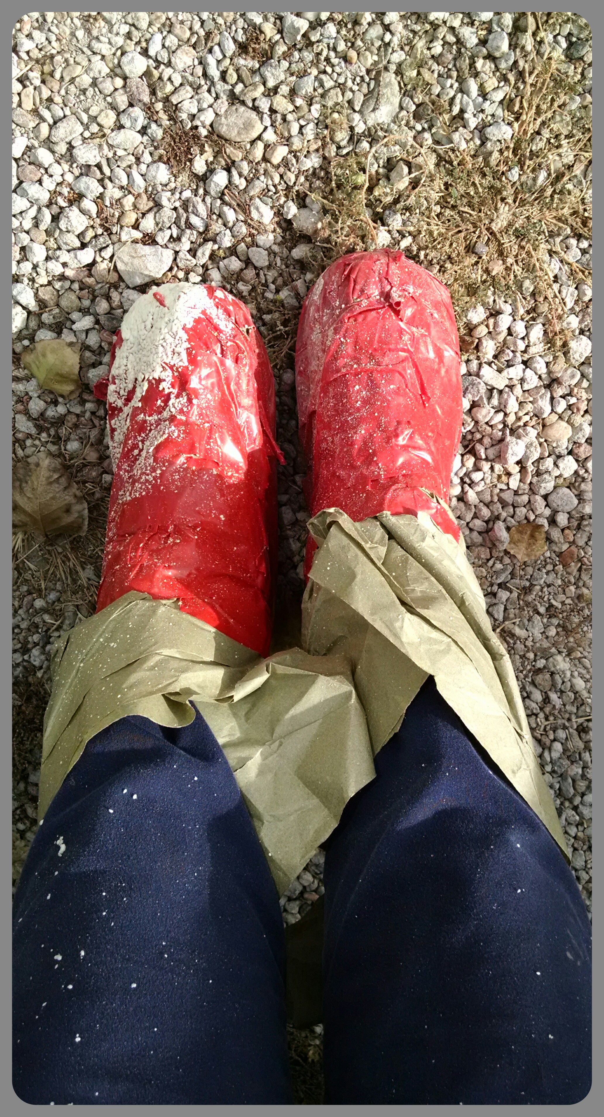 The rather large snake on the ground is the foam hose and on the end of it obviously is the spray gun. It’s nice to have someone tail the hose and keep it out of the way, especially on a small surface. *Below* Boots are wrapped and taped so I don’t have to buy new ones š and my dusk mask is on to breathe the clean air while sanding the walls inside down. Ā