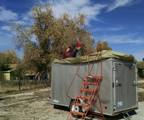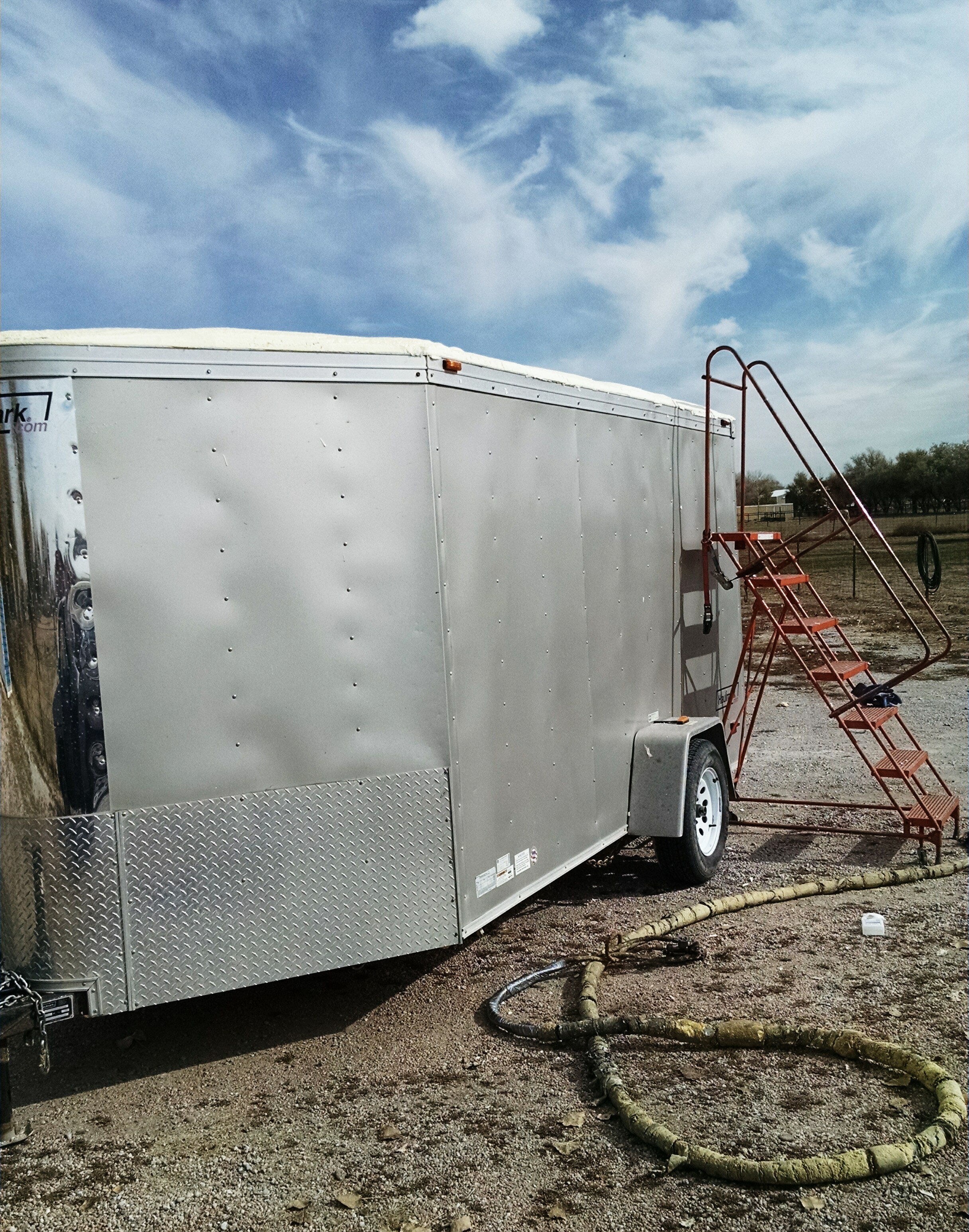 Originally, when we foamed the trailer, we only put about 3/4 inch of foam on the roof, and it seemed to do the trick… that is until the cold front started creeping in. It really needed more, so we added another 2 inches or so, coated with silicone and threw some gray granules on top. Again, foam is Ben’s profession, it’s what he wakes up to go do every day, so I was his “helper”. I basically tailed the hose and carried it behind (it’s a rather large hose… you’ll see below), cleaned up the job-site, taped up wind blockers and back spray, blew off the roof etc etc. LikeĀ an assistant.