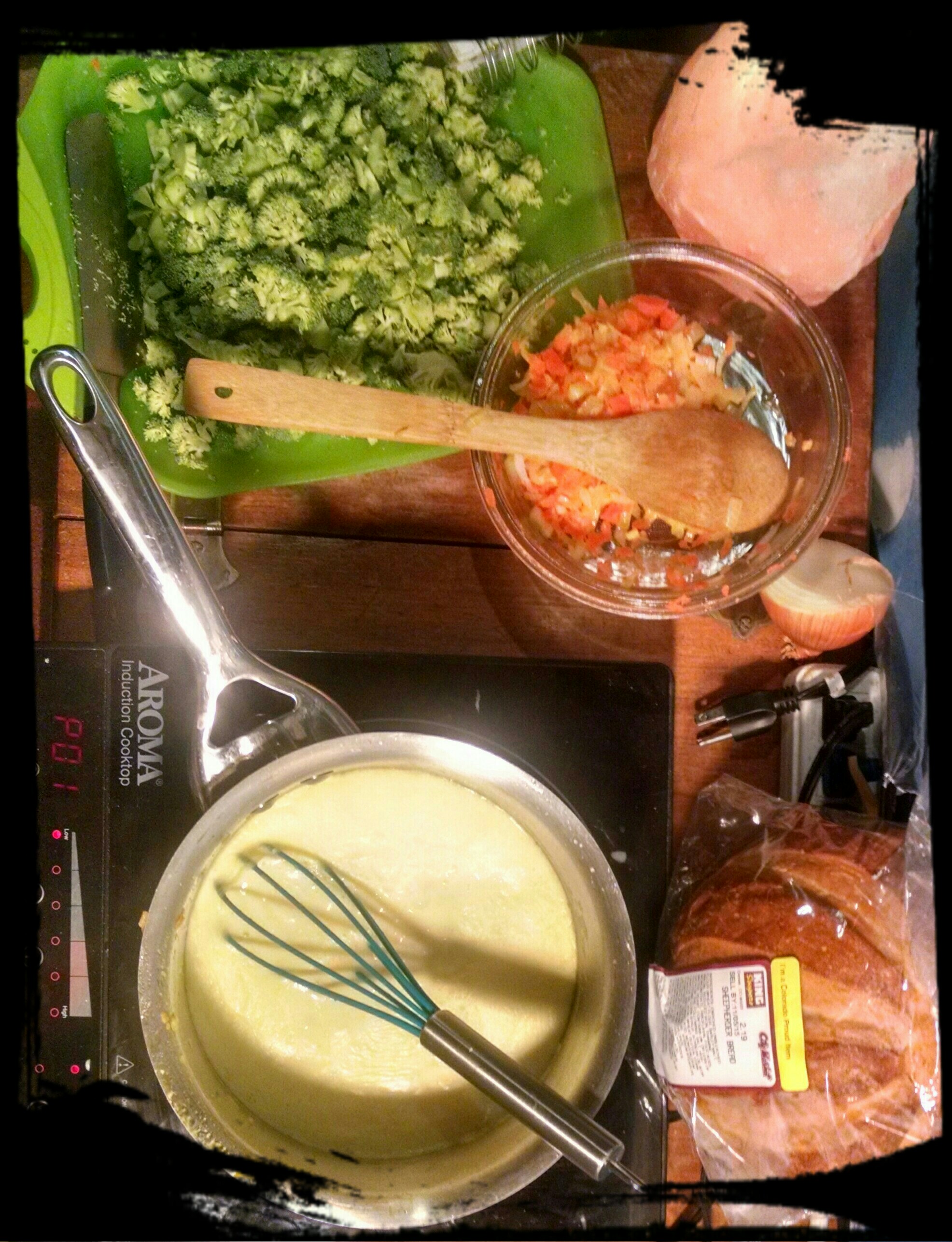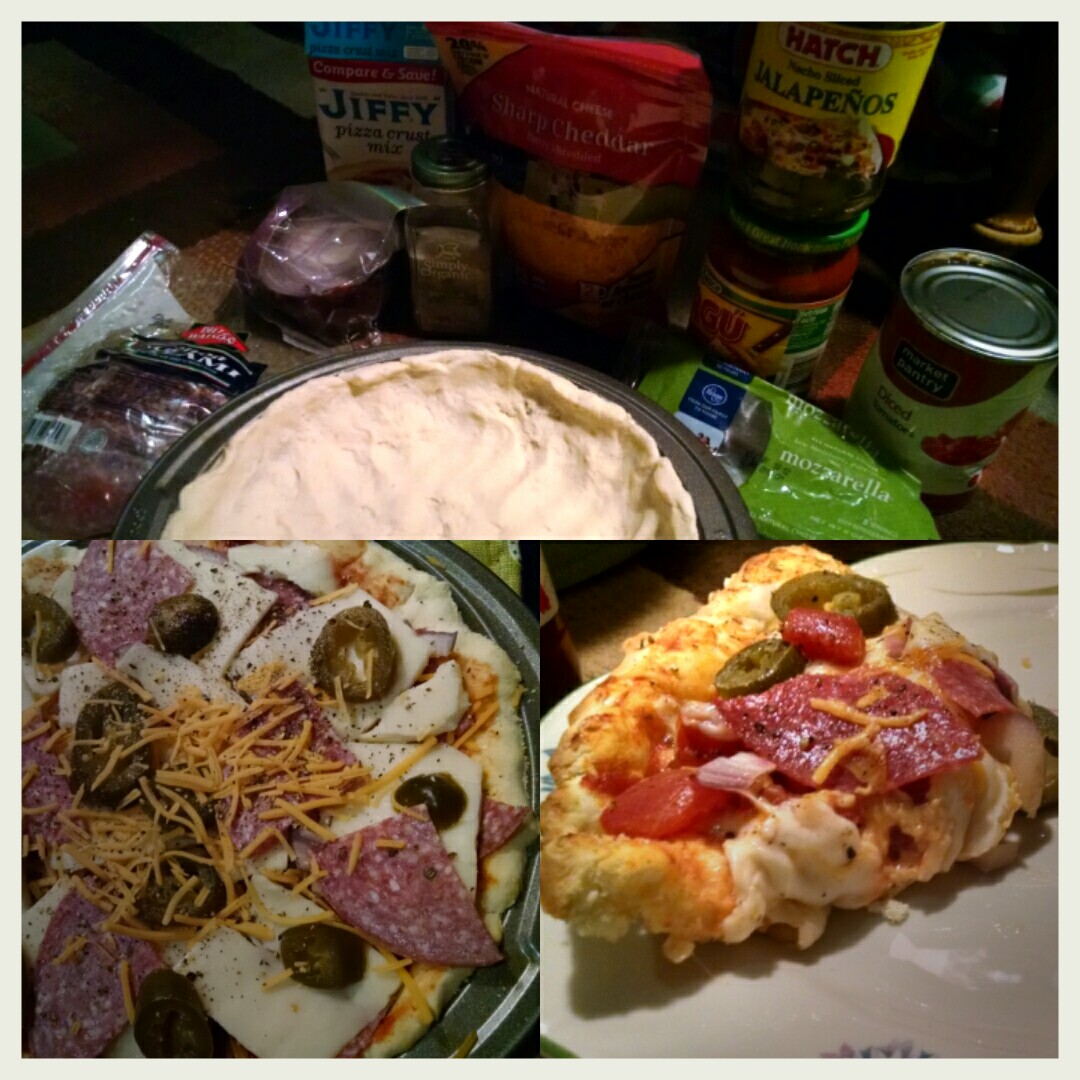 Anywho, I don’t like spending a lot of time on the crust, so honestly I just buy the Jiffy pizza crust mix, yeah the one that cost a bit under $2.00 and you just add water, that one. It’s rather good, I am able to create a “deep dish” or thin crust if I desired, and it is so quick to make.